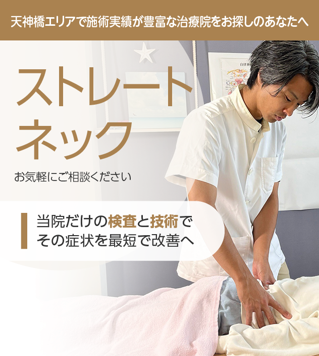 病院やほかの治療院で改善しなかったとしても諦める必要はありません。ストレートネックは豊富な施術実績を誇る当院にお任せください。